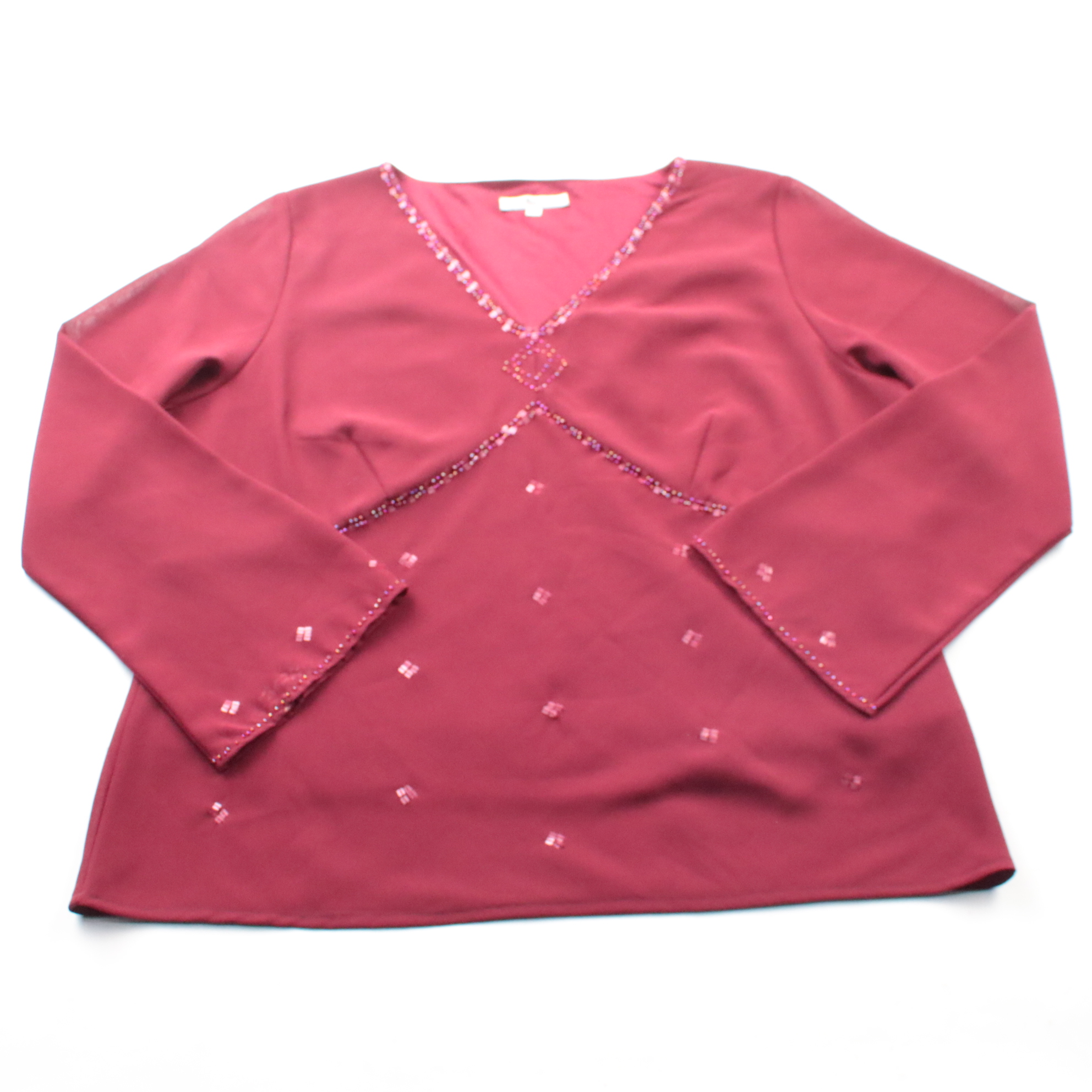 Блузка Klass бордового цвета с V‑вырезом и декоративной отделкой бисером по линии выреза и под грудью. Подойдёт для офиса и на выход, хорошо сочетается с юбкой или брюками. Материал из полиэстера практически не мнётся и быстро сохнет.