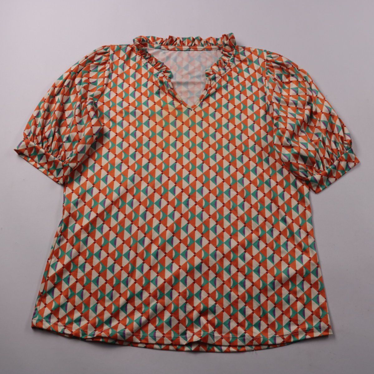 Женская блузка с геометрическим разноцветным принтом и V-образным вырезом с рюшами. Подойдёт для лета и тёплой погоды, можно носить с джинсами или юбкой в повседневных и офисных образах. Лёгкая вискозная ткань комфортна и хорошо дышит.