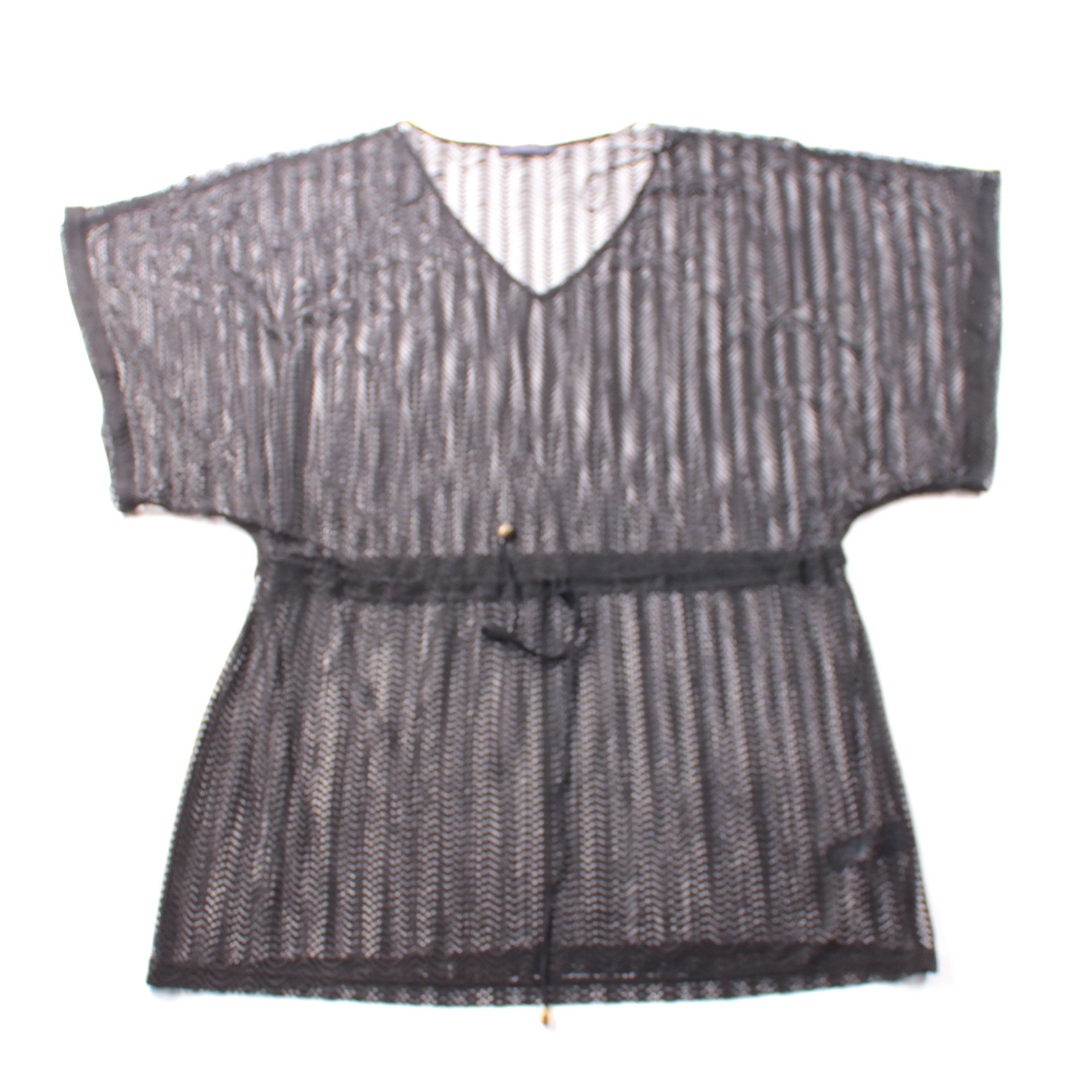 Женская блузка-туника M&S Collection из ажурного материала, чёрного цвета, с V-образным вырезом и кулиской на талии. Подойдёт как лёгкая накидка на пляж/бассейн и для летних прогулок поверх топа. Практичный плюс — быстро сохнет и почти не мнётся.