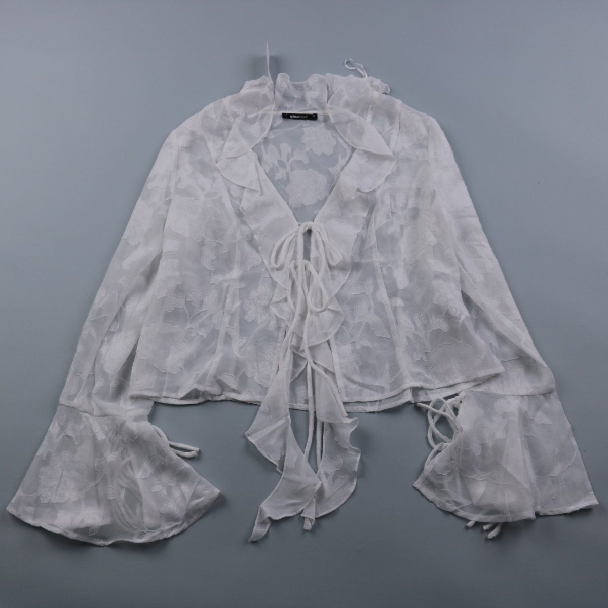 Полупрозрачная белая блузка Ginatricot с рюшами по горловине и завязками спереди, с расклешёнными длинными рукавами. Подойдёт для летних образов и вечерних выходов поверх топа или бра. Лёгкий полиэстер быстро сохнет и почти не мнётся.