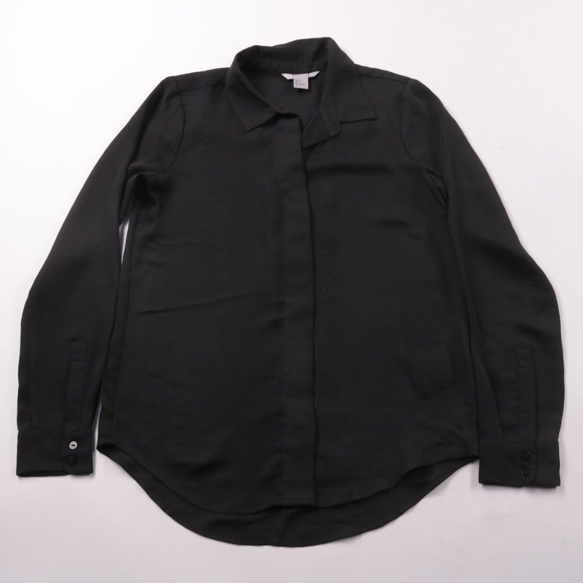 Женская чёрная блузка H&M с длинным рукавом и классическим воротником. Подойдёт для офиса и повседневных образов, хорошо сочетается с брюками и юбками. Лаконичная застёжка делает её удобной для многослойных комплектов.