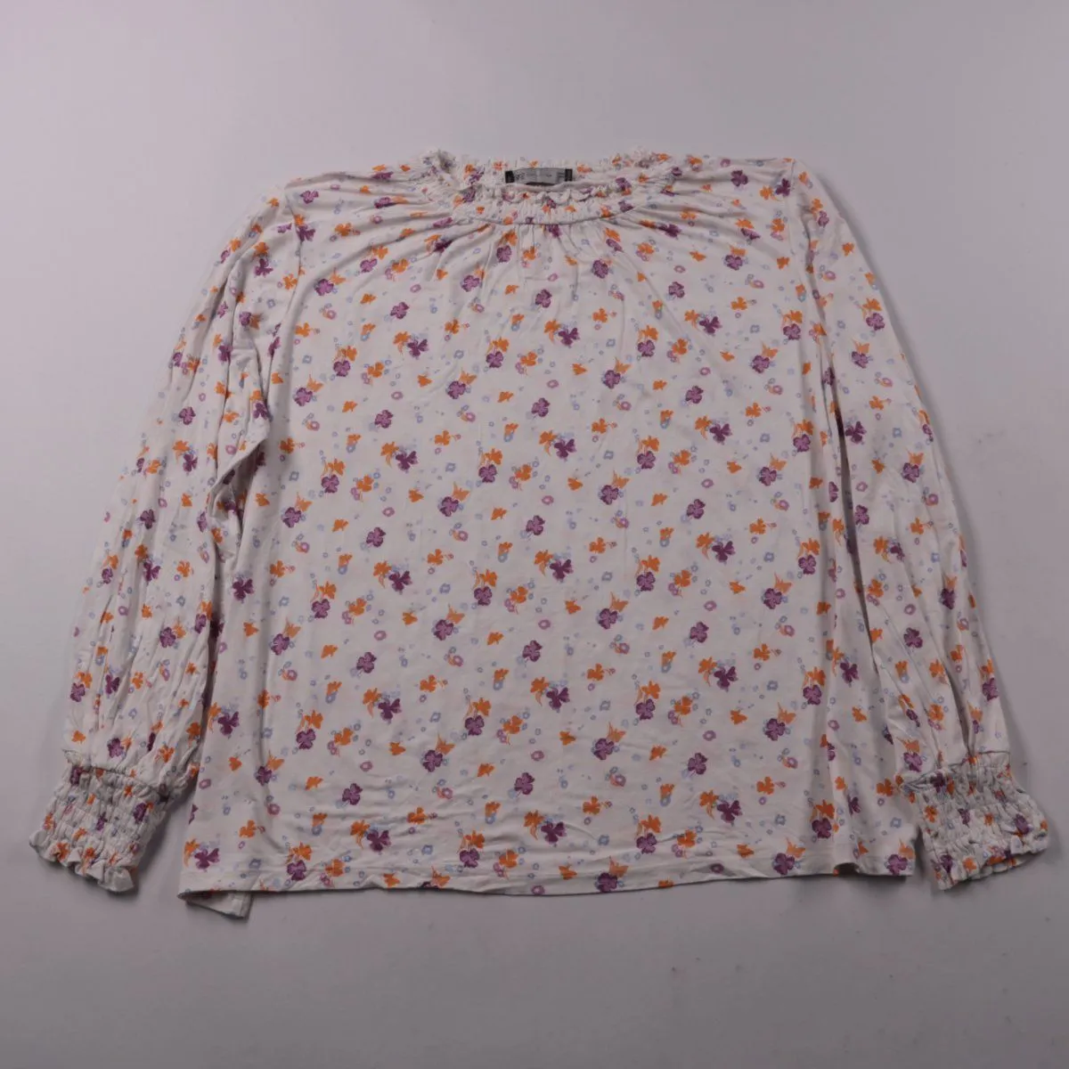 Женская блузка M&S кремового цвета с мелким цветочным принтом и сборкой по горловине. Длинные рукава с эластичными манжетами, подойдёт для повседневных образов и офиса. Практична в носке благодаря вискозе с добавлением эластана.
