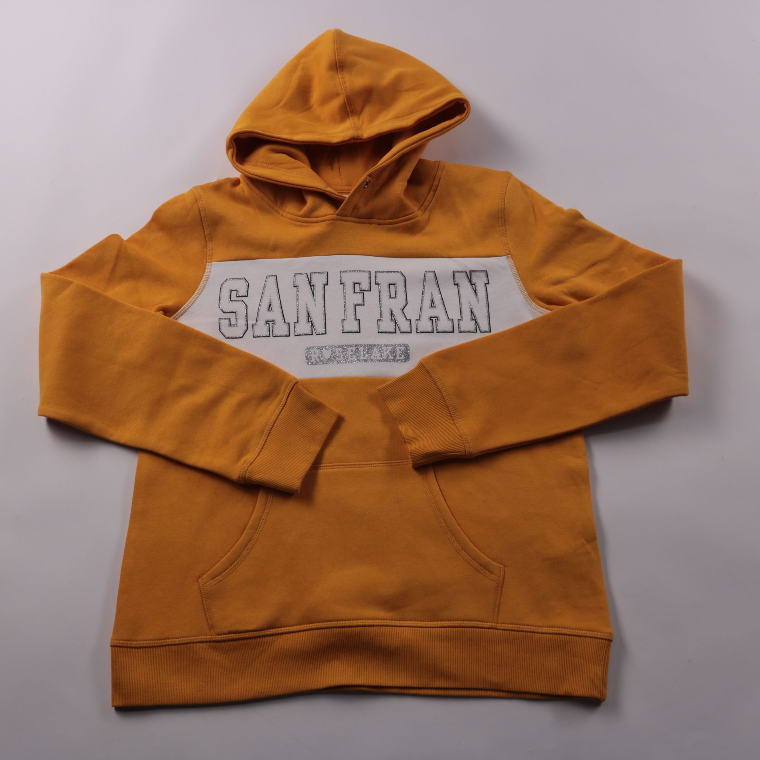 Толстовка H&M горчичного цвета с капюшоном и принтом SAN FRAN, внутри мягкий начёс. Подойдёт для повседневных образов и прогулок в прохладную погоду. Практичный плюс — удобный карман-кенгуру и плотные манжеты, которые держат форму.