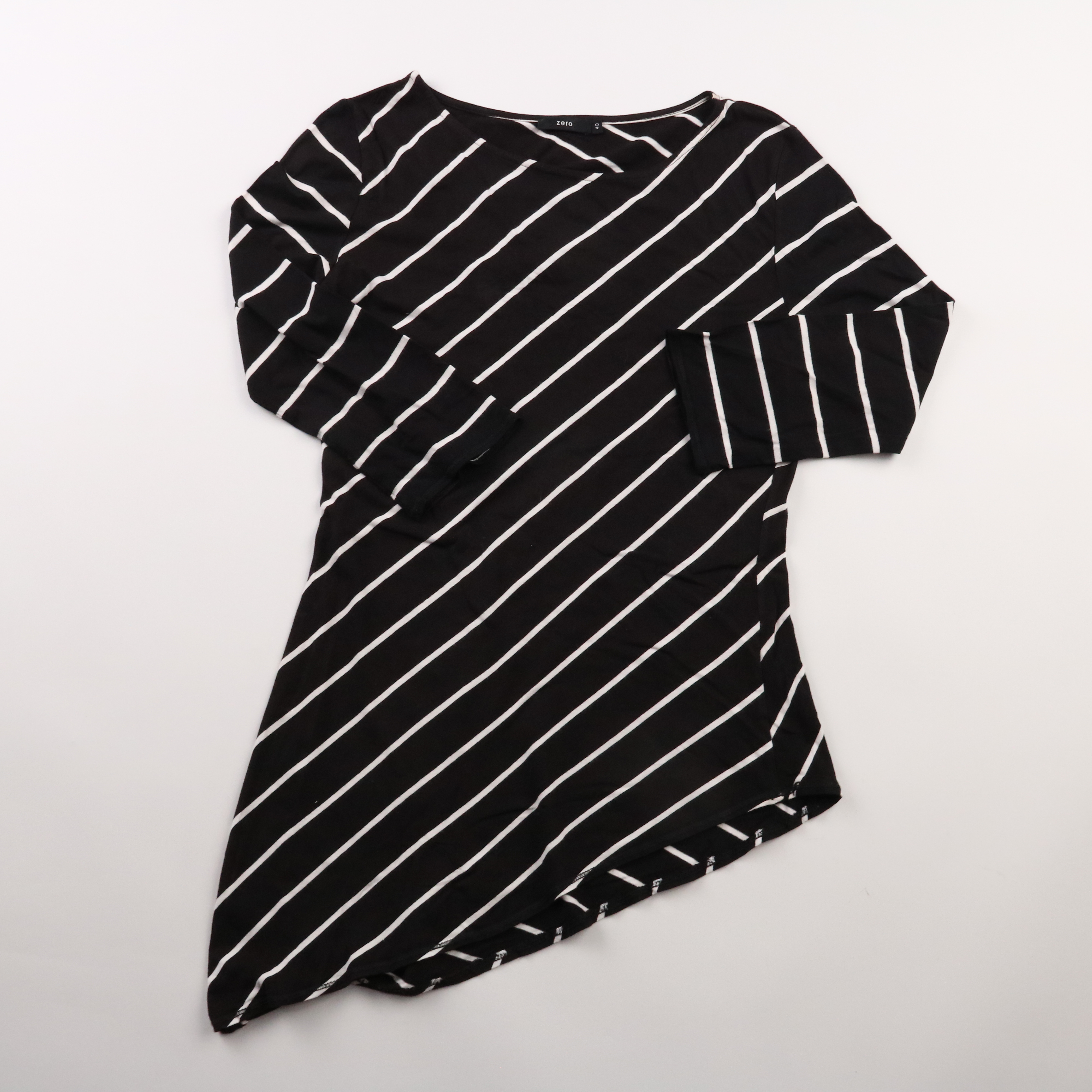 Лонгслив Zero в чёрном цвете с белыми диагональными полосками и рукавом 3/4. Подойдёт для повседневных образов и офиса в сочетании с джинсами или однотонной юбкой. Лёгкая ткань и свободный крой удобны для носки в течение дня.