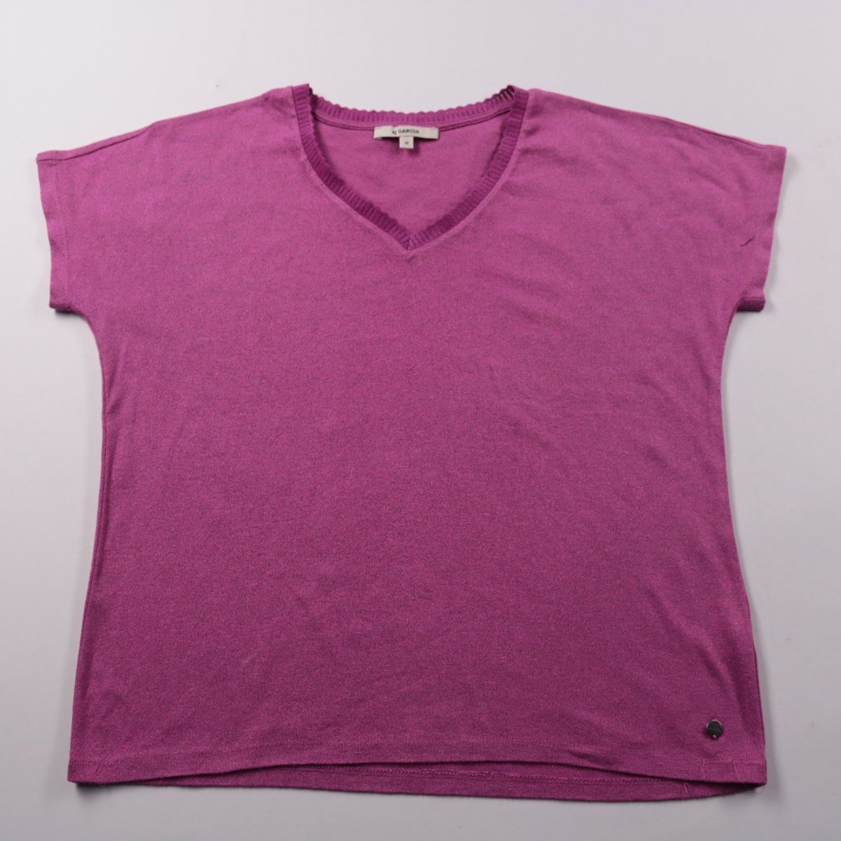Футболка Garcia с V-образным вырезом и коротким рукавом, трикотаж с легким металлическим блеском. Подойдёт для повседневных образов и офиса в стиле casual, хорошо сочетается с джинсами и юбками. Материал мягкий и эластичный, удобно сидит и не сковывает движения.