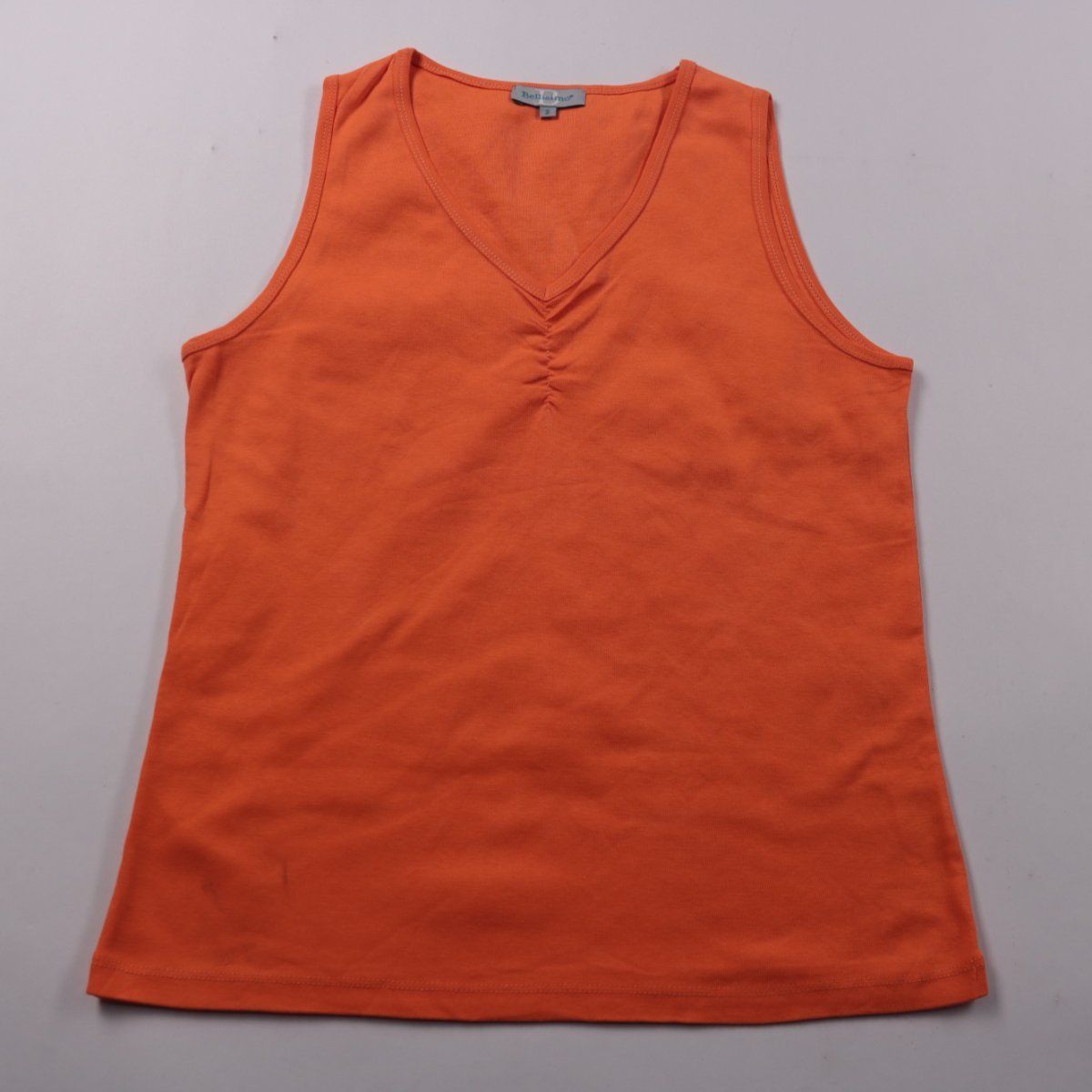 Женская майка Bellissimo оранжевого цвета с V-образным вырезом и небольшой сборкой по центру. Подойдёт для лета, дома или как базовый слой под рубашку/кардиган. Натуральный хлопок хорошо дышит и комфортен в носке.