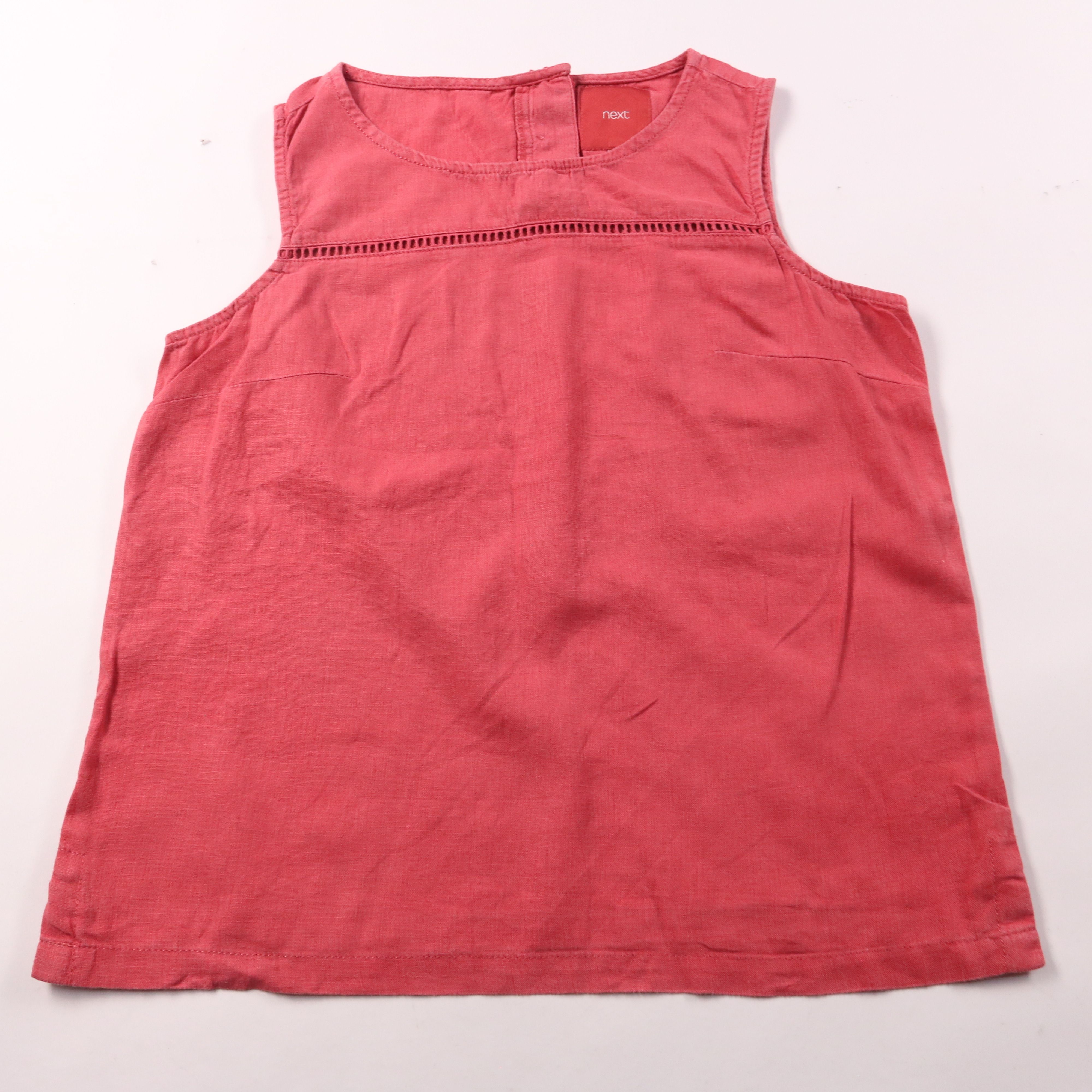 Женский топ Next кораллового цвета без рукавов, с декоративной ажурной вставкой по линии груди и застёжкой на пуговицы сзади. Подойдёт для тёплой погоды и повседневных образов. Льняная ткань хорошо дышит и комфортна в носке.