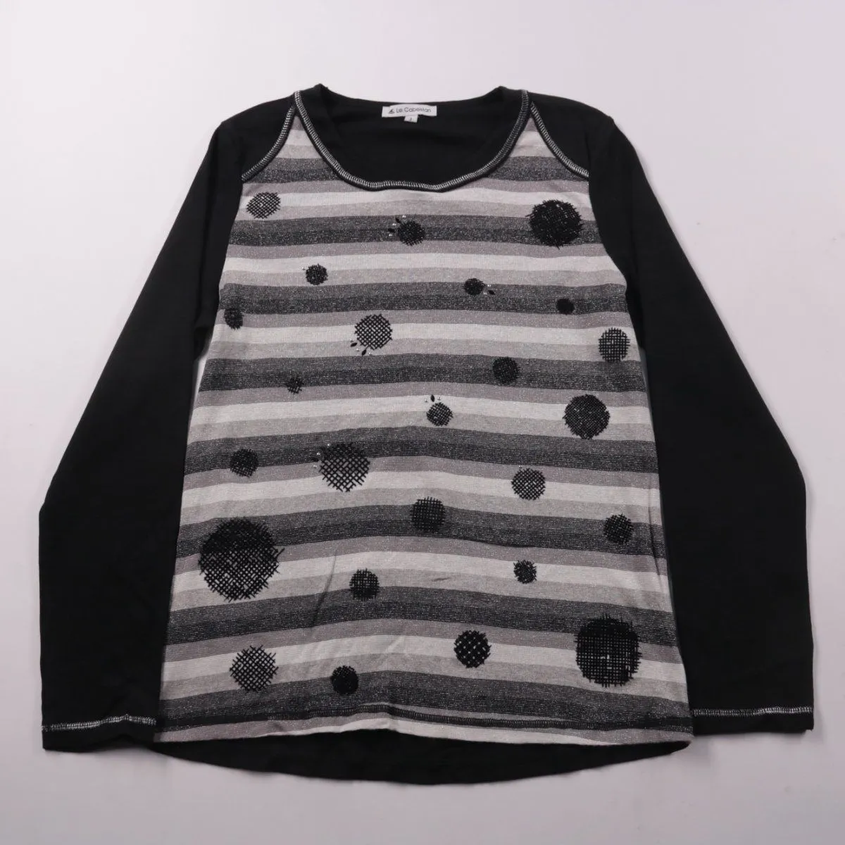 Женский лонгслив Le Cabestan с контрастной передней вставкой в серо-чёрную полоску и принтом в горошек. Подойдёт для повседневной носки и спокойных образов в демисезон. Хлопковая основа приятна к телу и хорошо дышит.