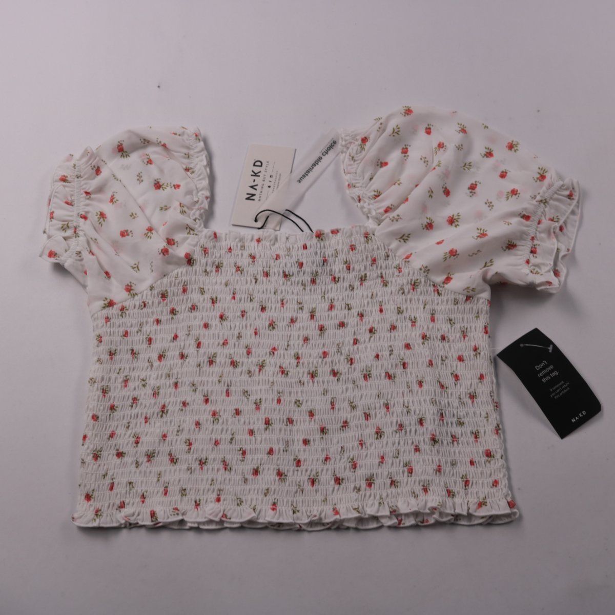 Топ NA-KD белого цвета с мелким цветочным принтом и присборенным (smock) эластичным лифом. Короткие рукава-фонарики и квадратный вырез делают модель удобной для тёплой погоды и летних образов. За счёт эластичной сборки хорошо садится и не стесняет движения.