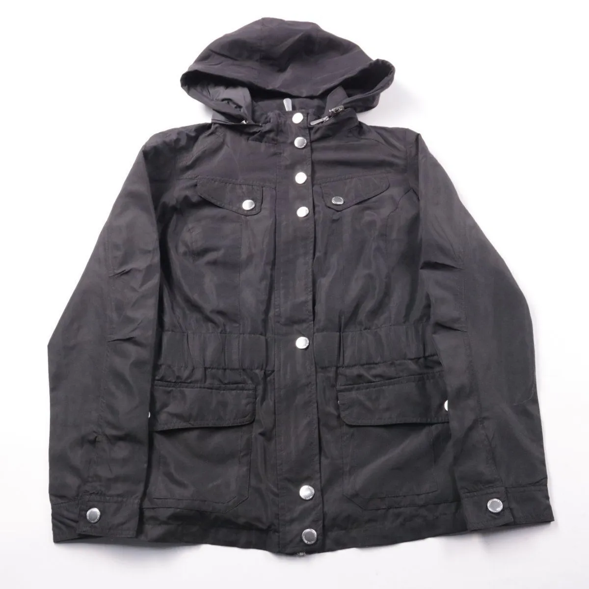 Женская демисезонная куртка TCM Travel Edition чёрного цвета с капюшоном и накладными карманами на кнопках. Подойдёт для прогулок и поездок в прохладную погоду, удобна за счёт застёжки на кнопках и практичных карманов.