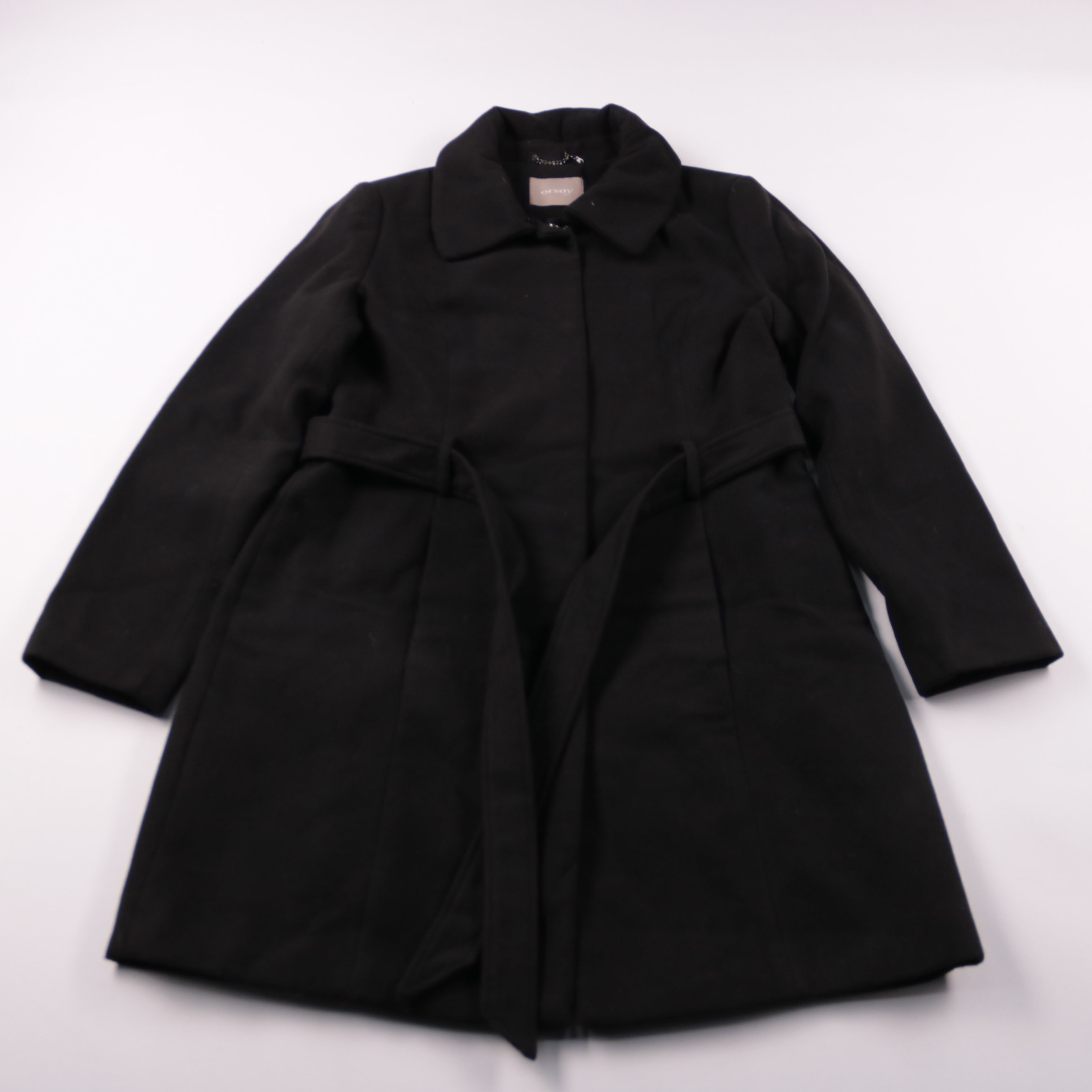 Женское пальто Orsay чёрного цвета, прямого силуэта с поясом и отложным воротником. Подойдёт для повседневной носки и офисных образов в прохладную погоду. Практичный вариант: легко сочетать с любой обувью и аксессуарами благодаря базовому цвету.