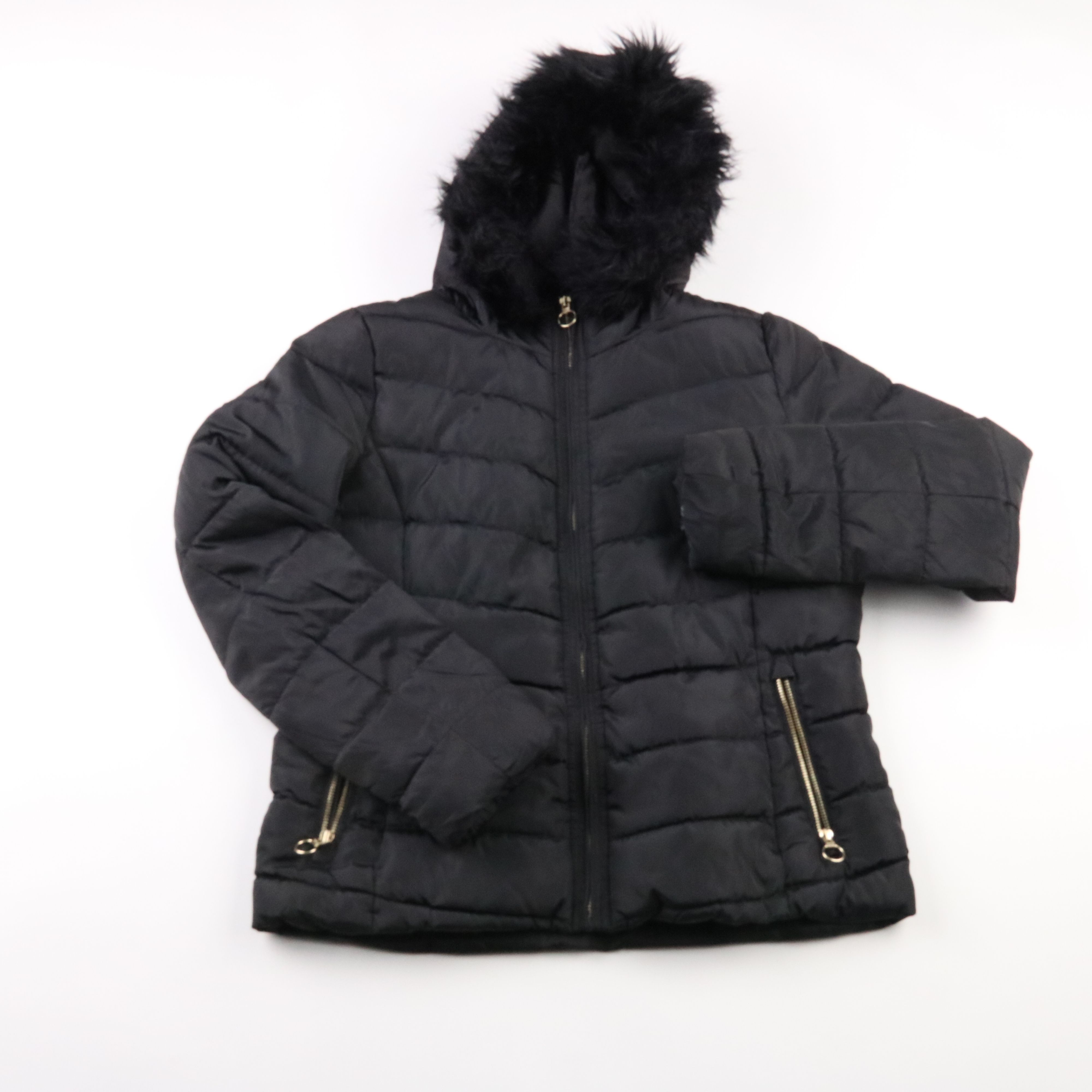 Женская стёганая зимняя куртка H&M чёрного цвета с тёплым капюшоном с искусственным мехом. Подойдёт для повседневной носки в холодную погоду и прогулок по городу. Удобные карманы на молниях и застёжка-молния по всей длине делают её практичной.