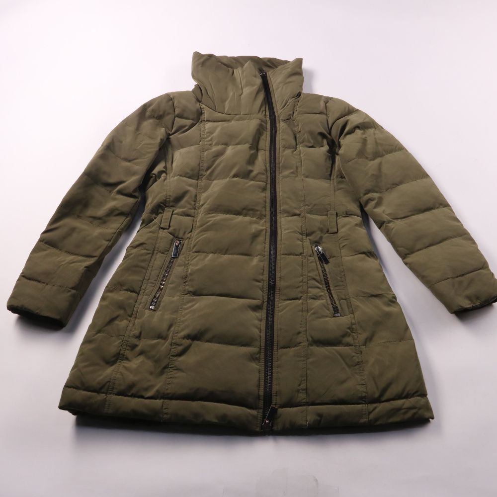 Удлинённый стёганый пуховик Mango цвета хаки с высоким воротником и застёжкой на молнию. Подойдёт для зимних прогулок и повседневных образов, есть карманы на молнии. Практичный вариант: утеплённый и хорошо закрывает бёдра от ветра.