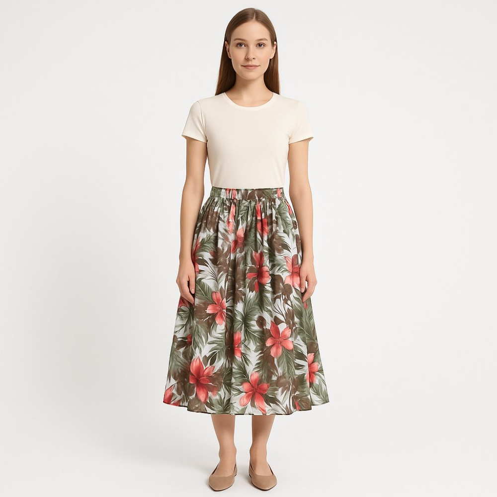 Юбка Etam миди с ярким цветочным принтом и мягкой посадкой на резинке. Подойдёт для лета и отдыха, легко сочетается с однотонными футболками и блузами. Практична тем, что комфортно сидит и не сковывает движения.