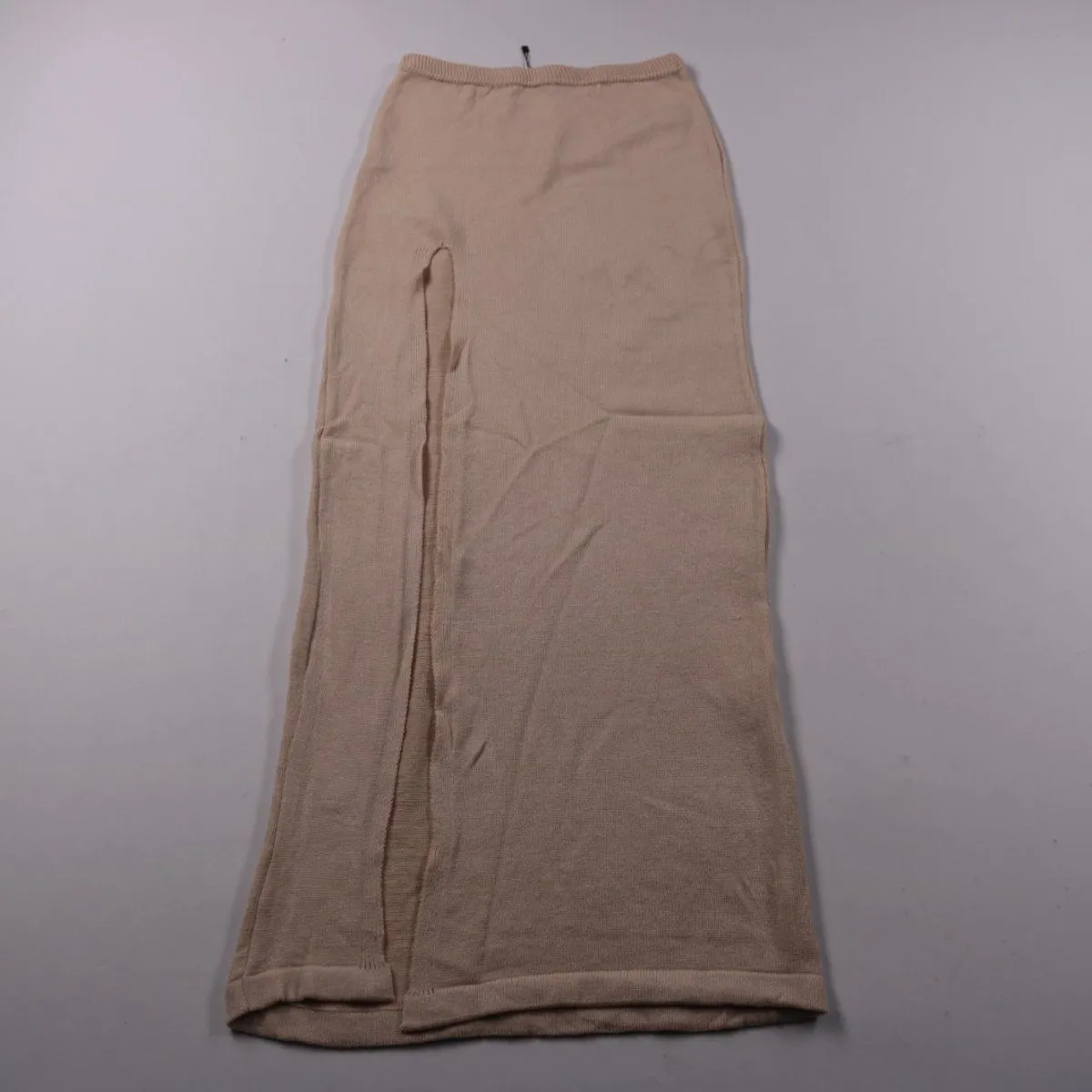 Вязаная юбка PrettyLittleThing бежевого цвета, размер L, с разрезом для свободного шага. Подойдёт для повседневных образов и на выход — легко сочетается с топами и свитерами. Эластичный пояс комфортно садится по талии и не сковывает движения.