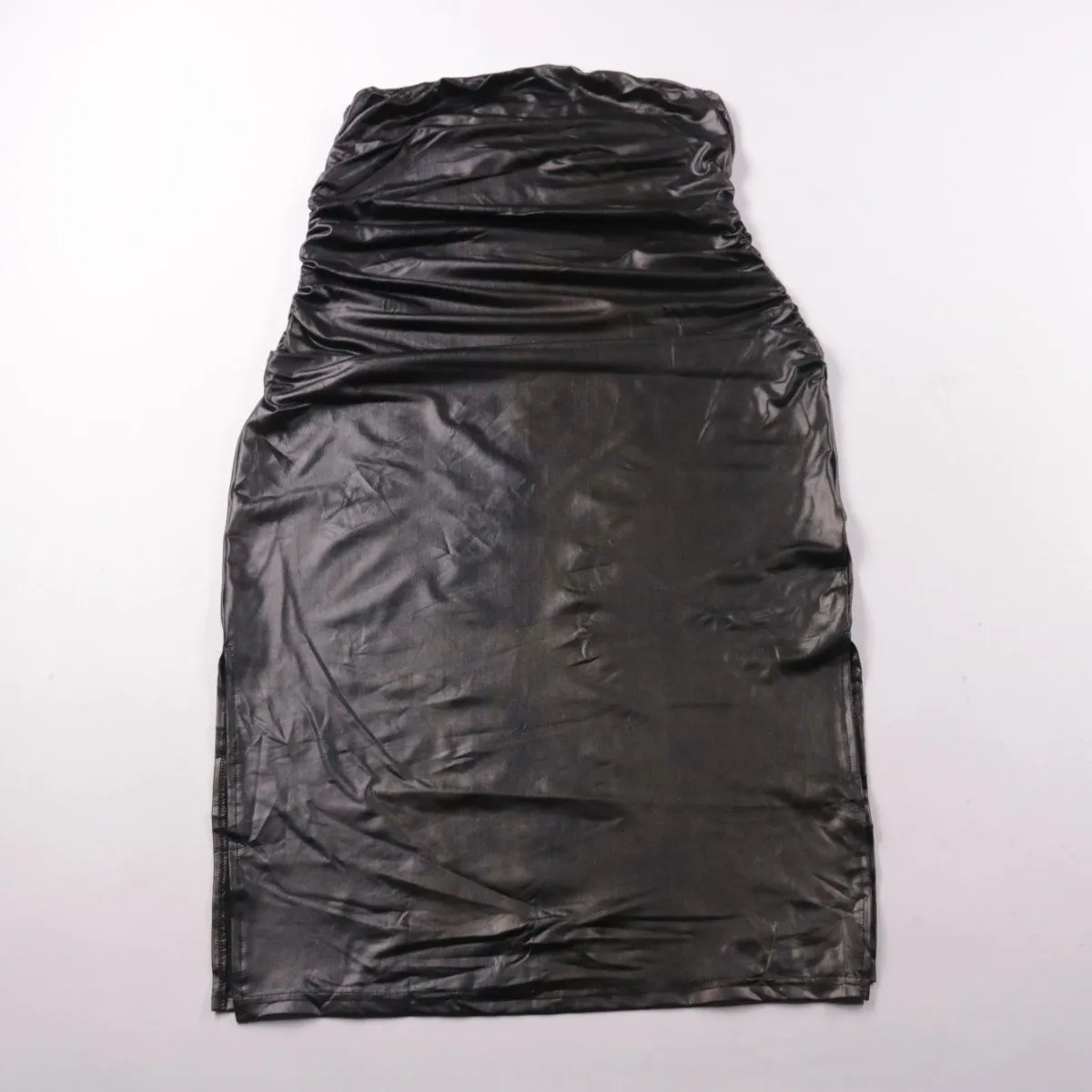 Юбка-карандаш из чёрного материала с глянцевым эффектом, без указания бренда. Подойдёт для вечерних образов и повседневных сочетаний с топом или рубашкой. Эластичный состав хорошо тянется и комфортно садится по фигуре.